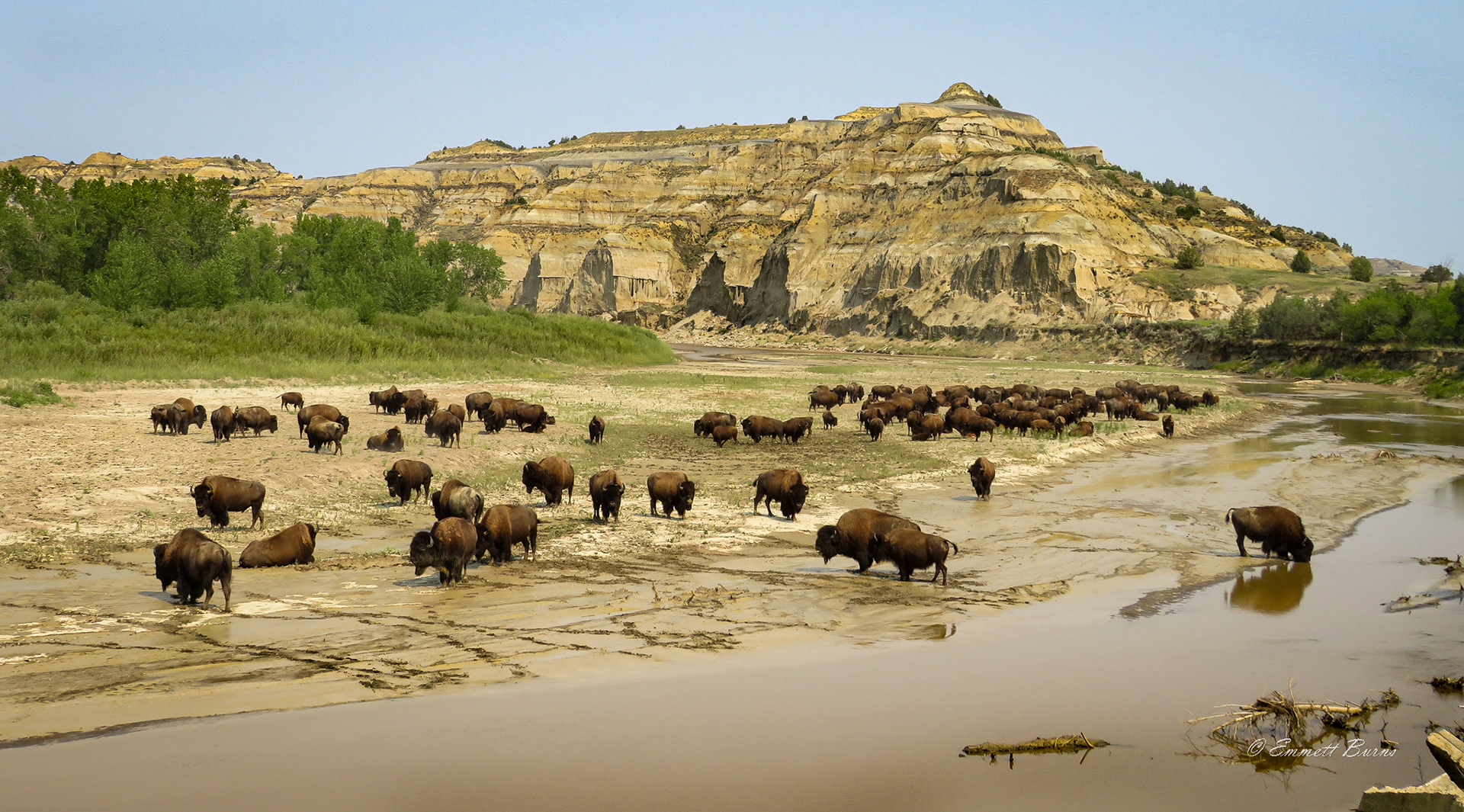 The park itself protects many acres of pristine Dakota badlands, as far as the eye can see. It is very different from Badlands National Park in neighboring South Dakota. Where Badlands is an arid and dry prairie landscape, Theodore Roosevelt is far more lively, in that there are a wide array of trees and other vegetation that has eked out a life there on the Little Missouri River. There is a north and south unit, and the Elkhorn Ranch unit in the middle, where Roosevelt’s ranch house stood.